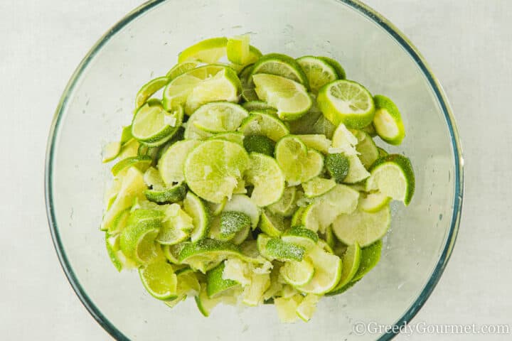 - Wash the limes then quarter them. Remove the pips and slice thinly.