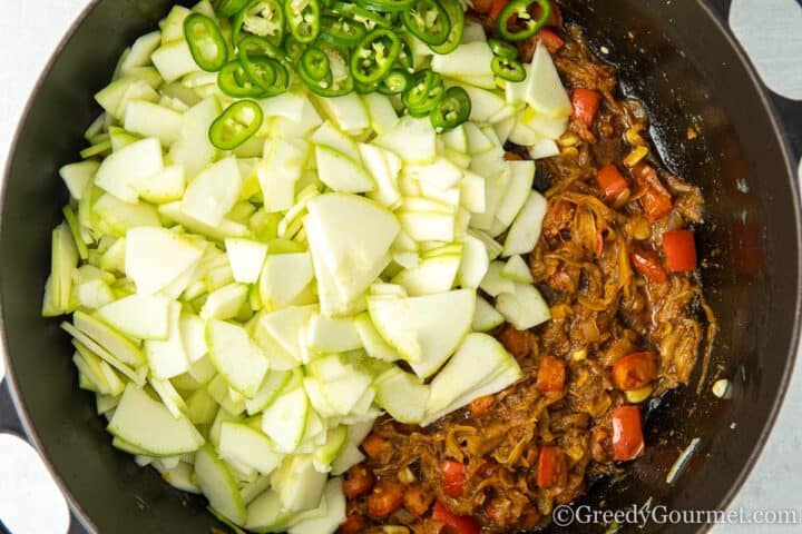 - Add the sliced marrow and chillies to the mix and stir well.