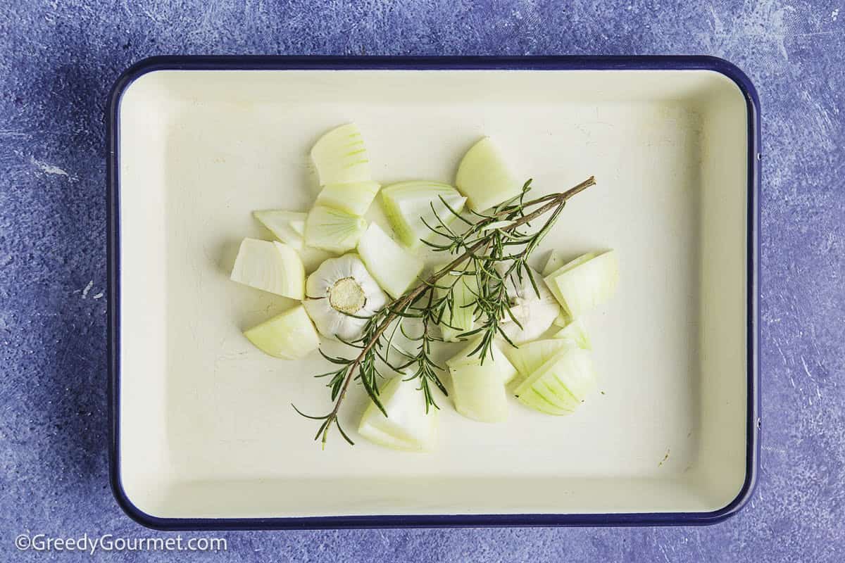 Peel and chop the onion roughly, halve the garlic bulb and arrange the pieces in a single layer in a roasting tin, along with the rosemary.